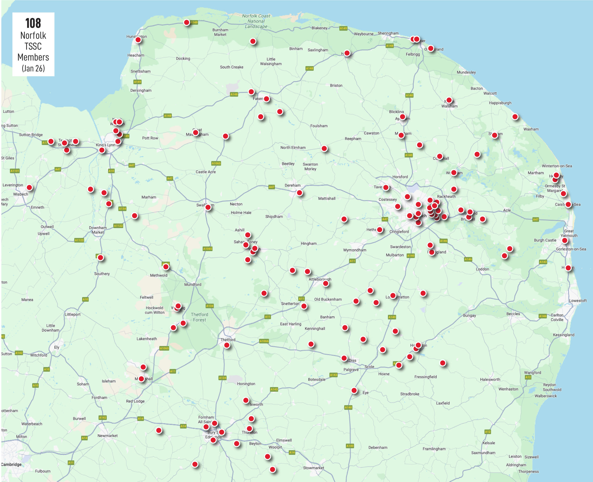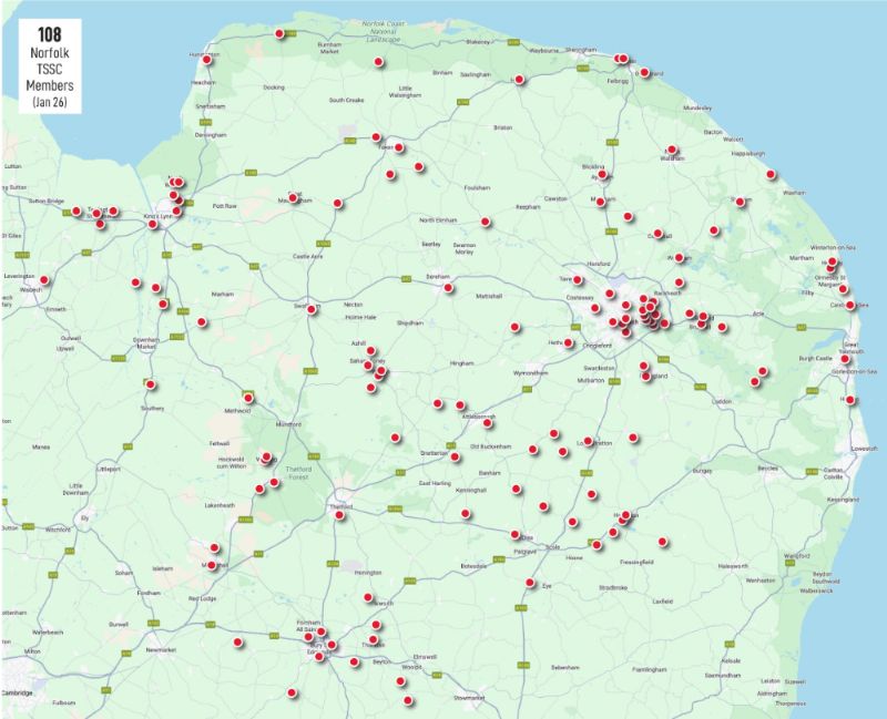 Some members have been asking me how many members the TSSC has in Norfolk. As of January 2026 we have 108. To get an idea of where they are in Norfolk click on the map under the downloads tab.
